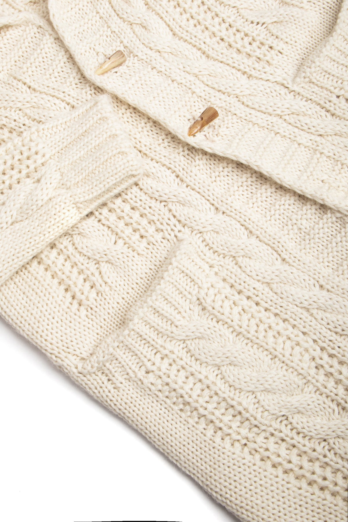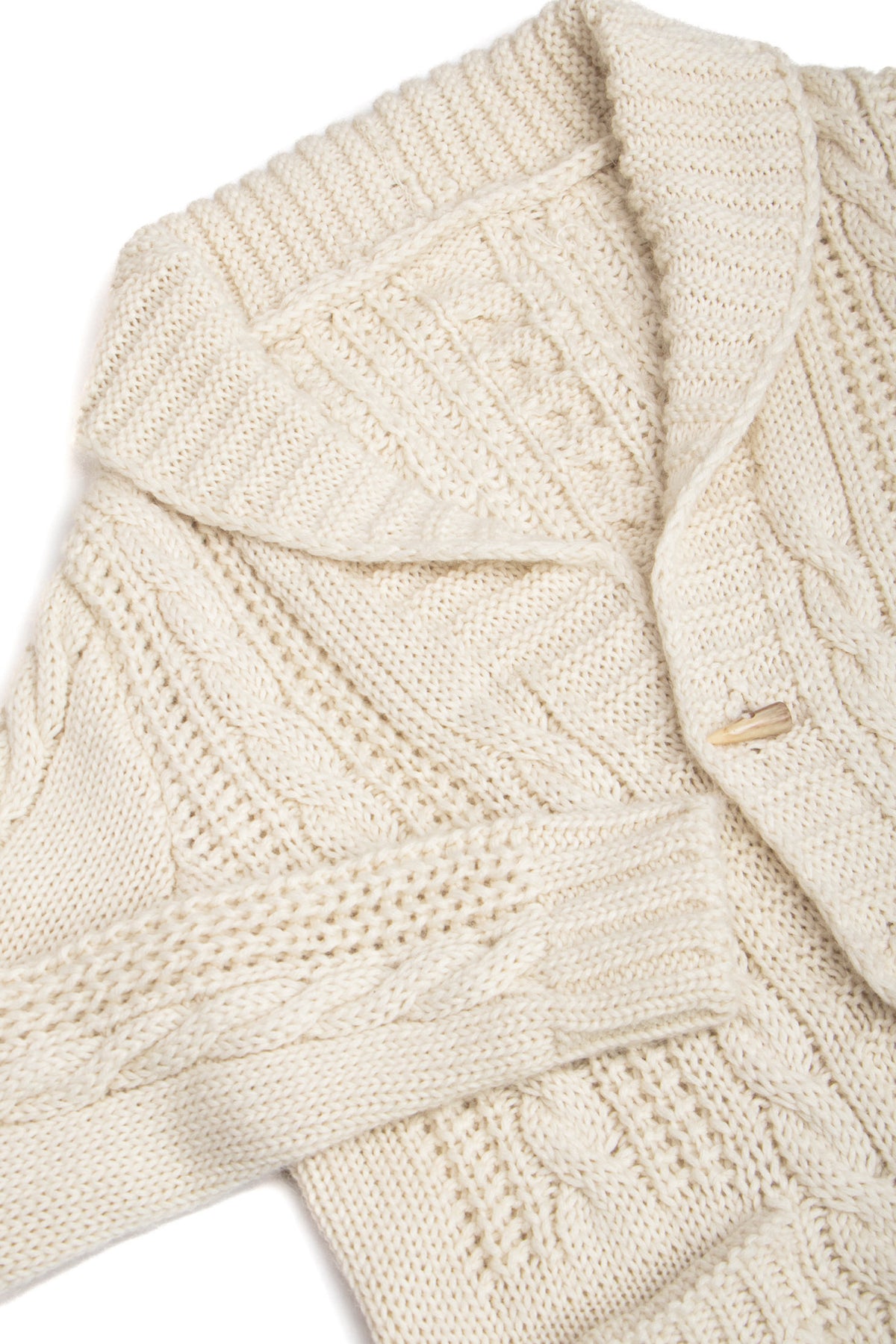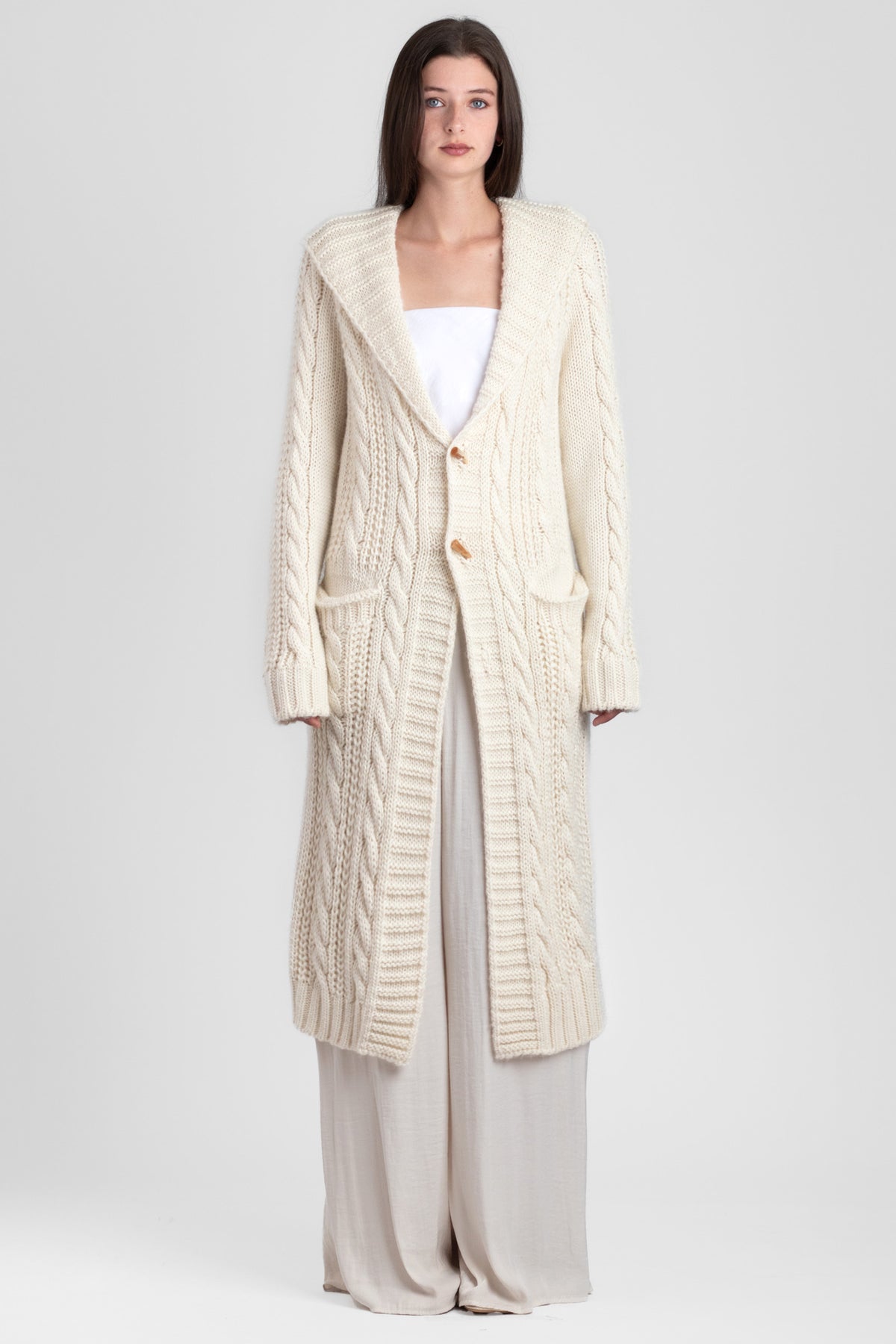 A shawl collar longline cable-design cardigan in Alpaca/Wool blend. Our showstopper of the season and Esme's favourite style to date.